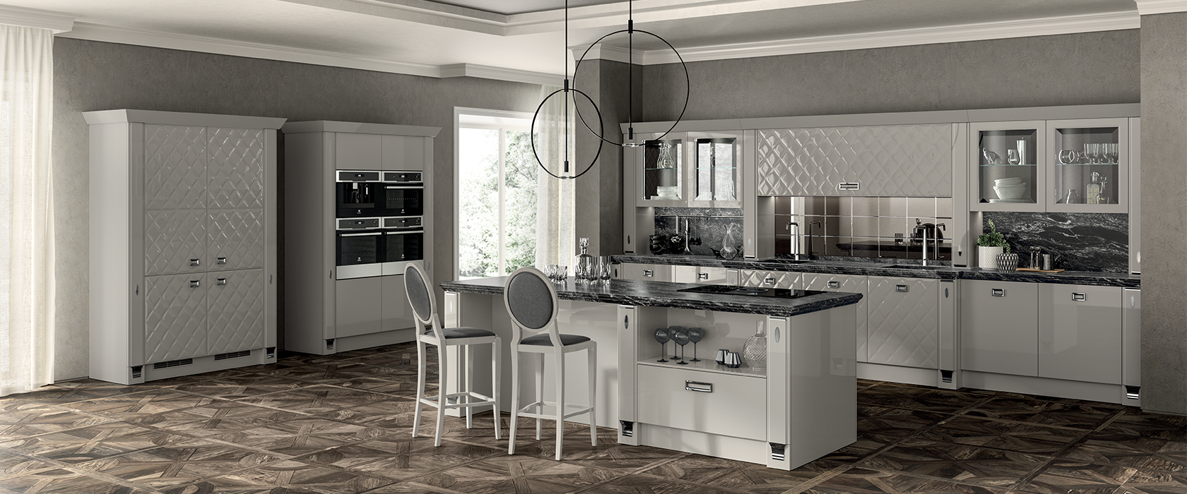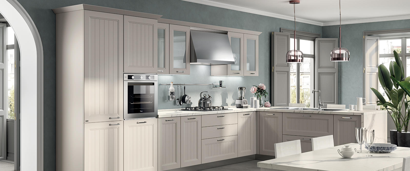 Colony rappresenta un’apertura ad una leggera nostalgia per alcuni stilemi tradizionali come l’anta con telaio. Quest’ultima è possibile averla sia non troppo lavorata, per offrire un tocco leggero, sia con la decorazione delle doghe verticali per chi richiede qualcosa in più.