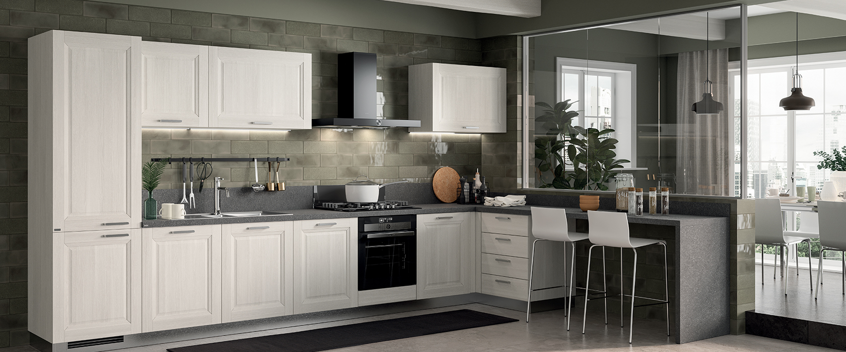 Con Family hai una cucina funzionale di grande qualità estetica ad un prezzo contenuto! Caratteristica principale del modello è l’anta con telaio con bugna che dona all’ambiente un effetto famigliare.