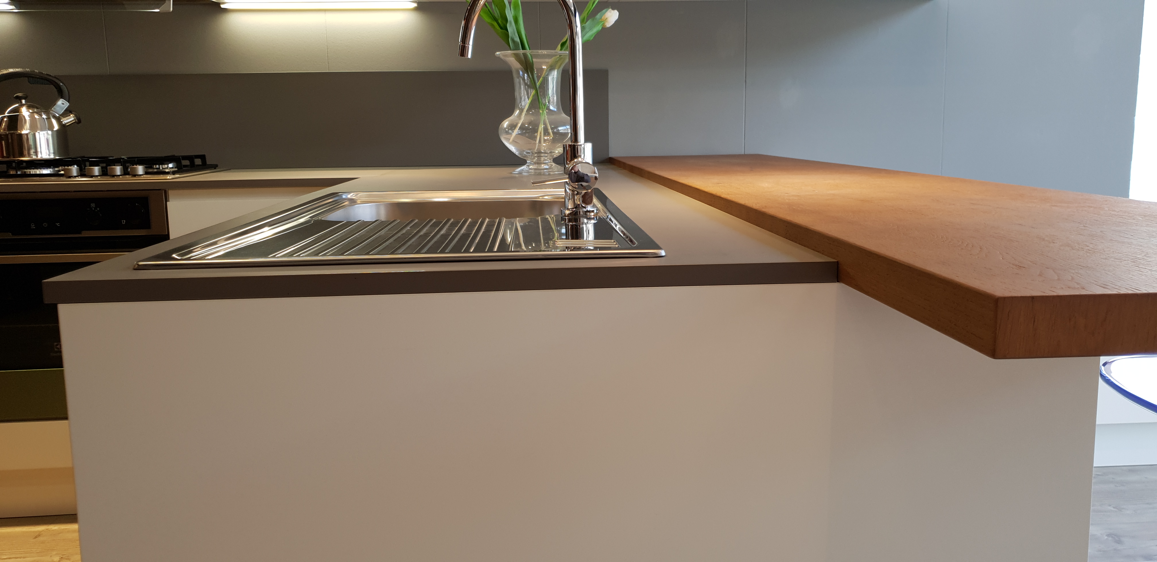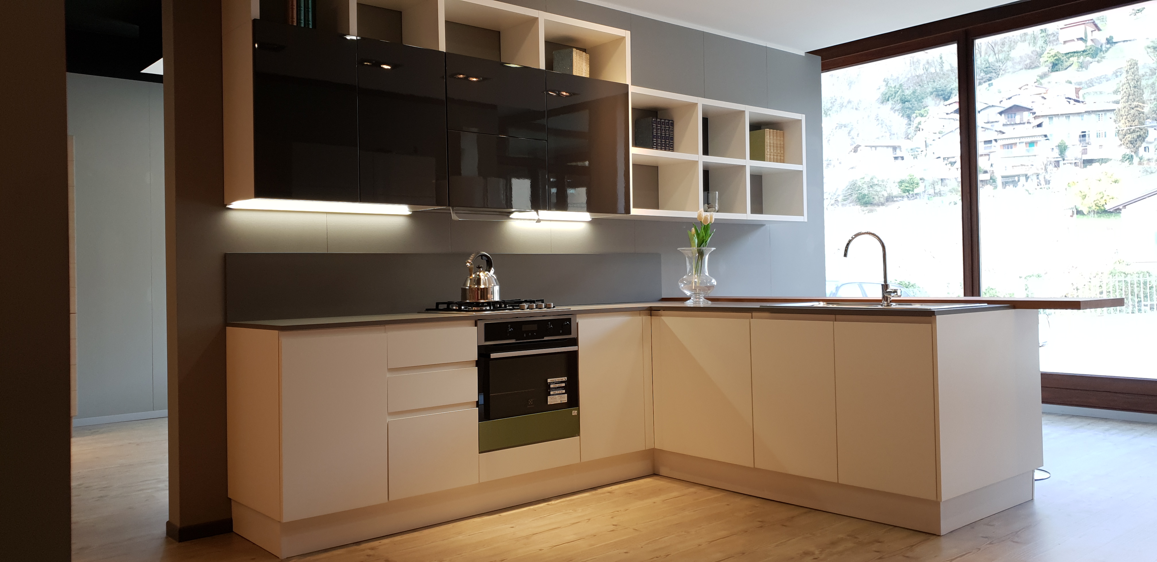 Ante: Basi in decorativo bianco e Pensili laccato lucido grigio scuro.