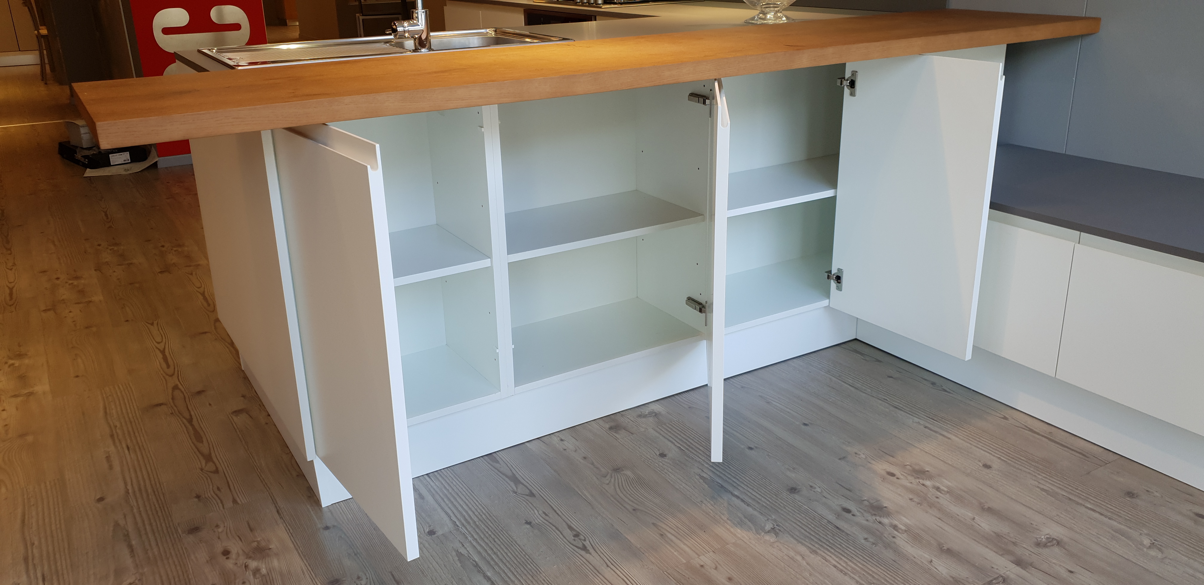 Luce sottopensile cm.60 con interruttore TOUCH. Fianchi a vista finiti in colore dell’anta. Zoccolo in alluminio finitura in tinta con le basi della cucina h.cm.10. Portaposate in pvc inserito nel cassetto da 45 cm, e tappetini in gomma.