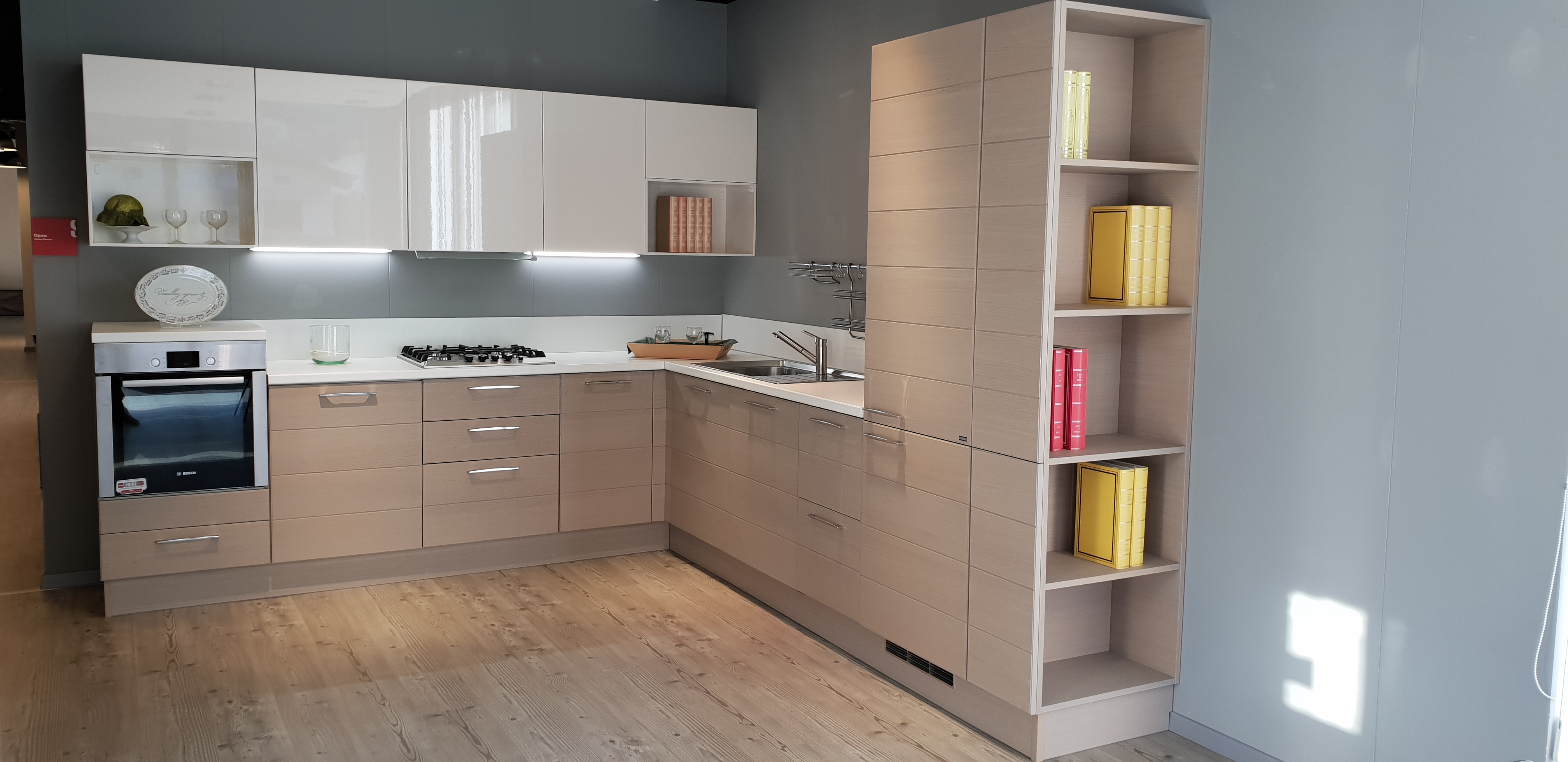Cucina Scavolini mod. Open in legno e pensili laccati lucidi