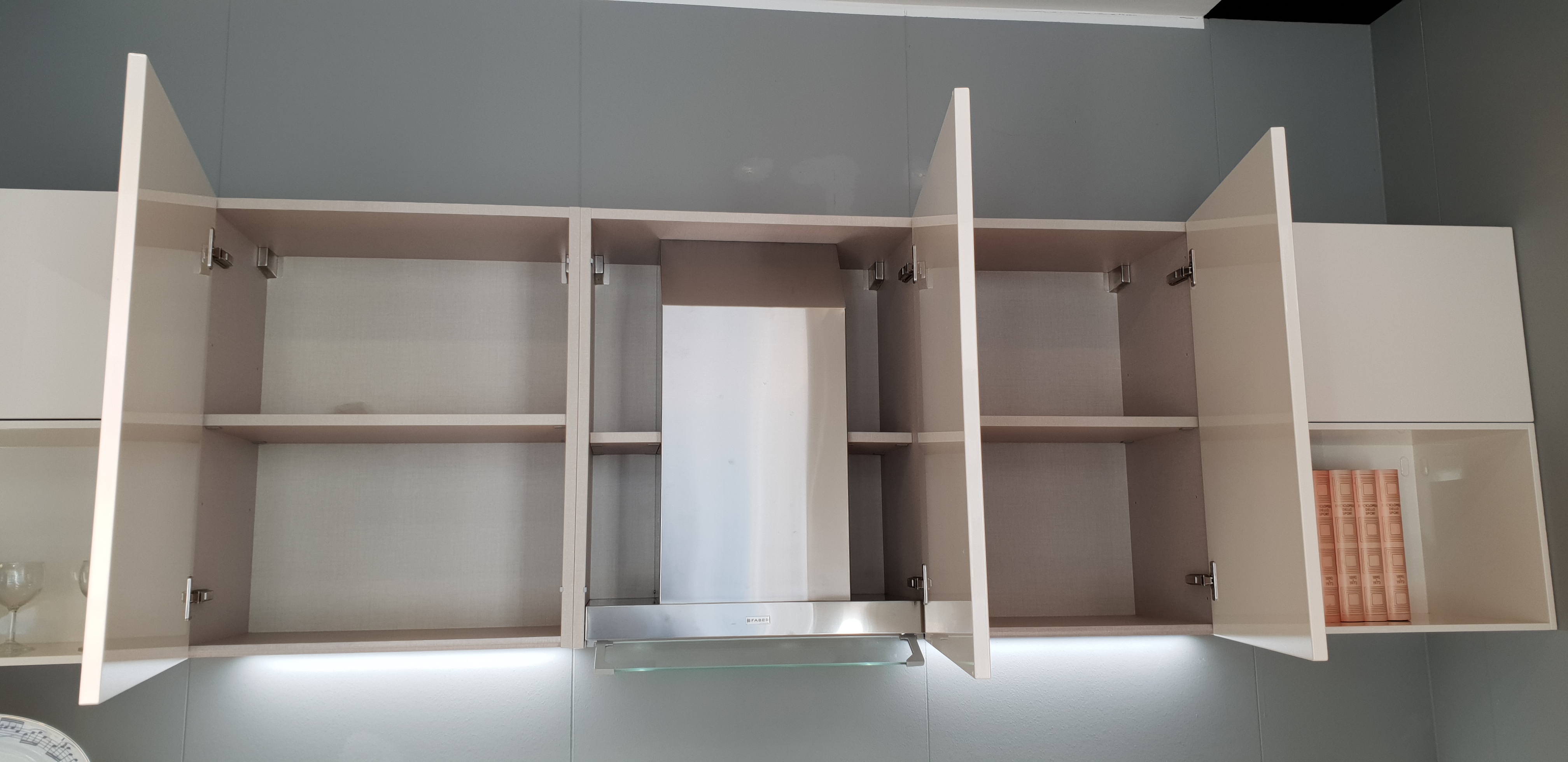 Ante: Basi in legno impiallacciato dogato e Pensili laccato lucido Bianco.
