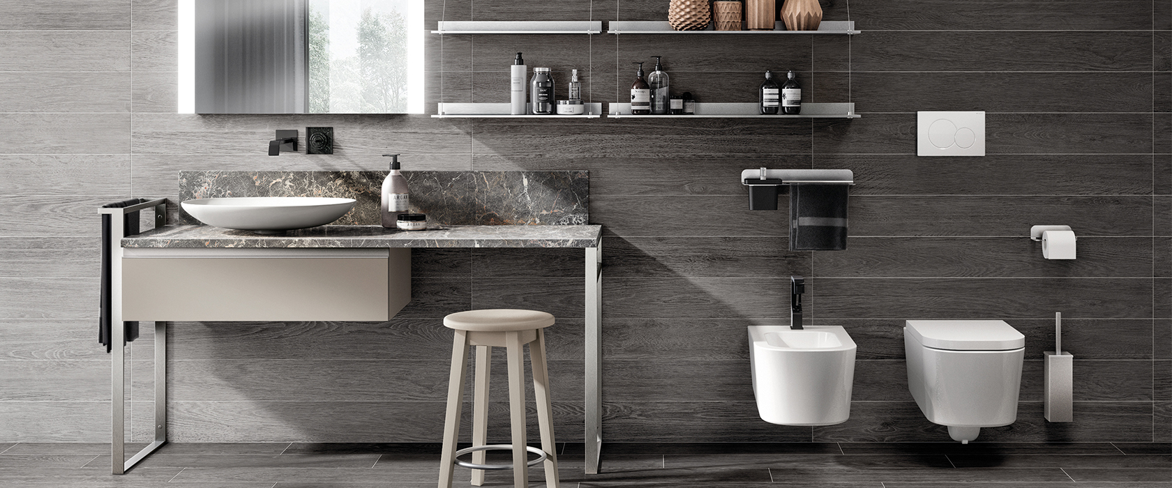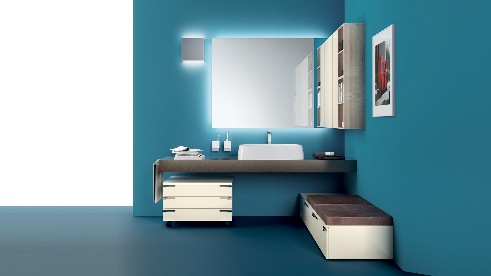 Il progetto Gym Space ridisegna gli elementi tipici dell’arredo bagno, combinandoli magistralmente con una struttura a parete dedicata all’attività fisica, e porta l’area fitness nella quotidianità, proponendo un nuovo concept di wellness.