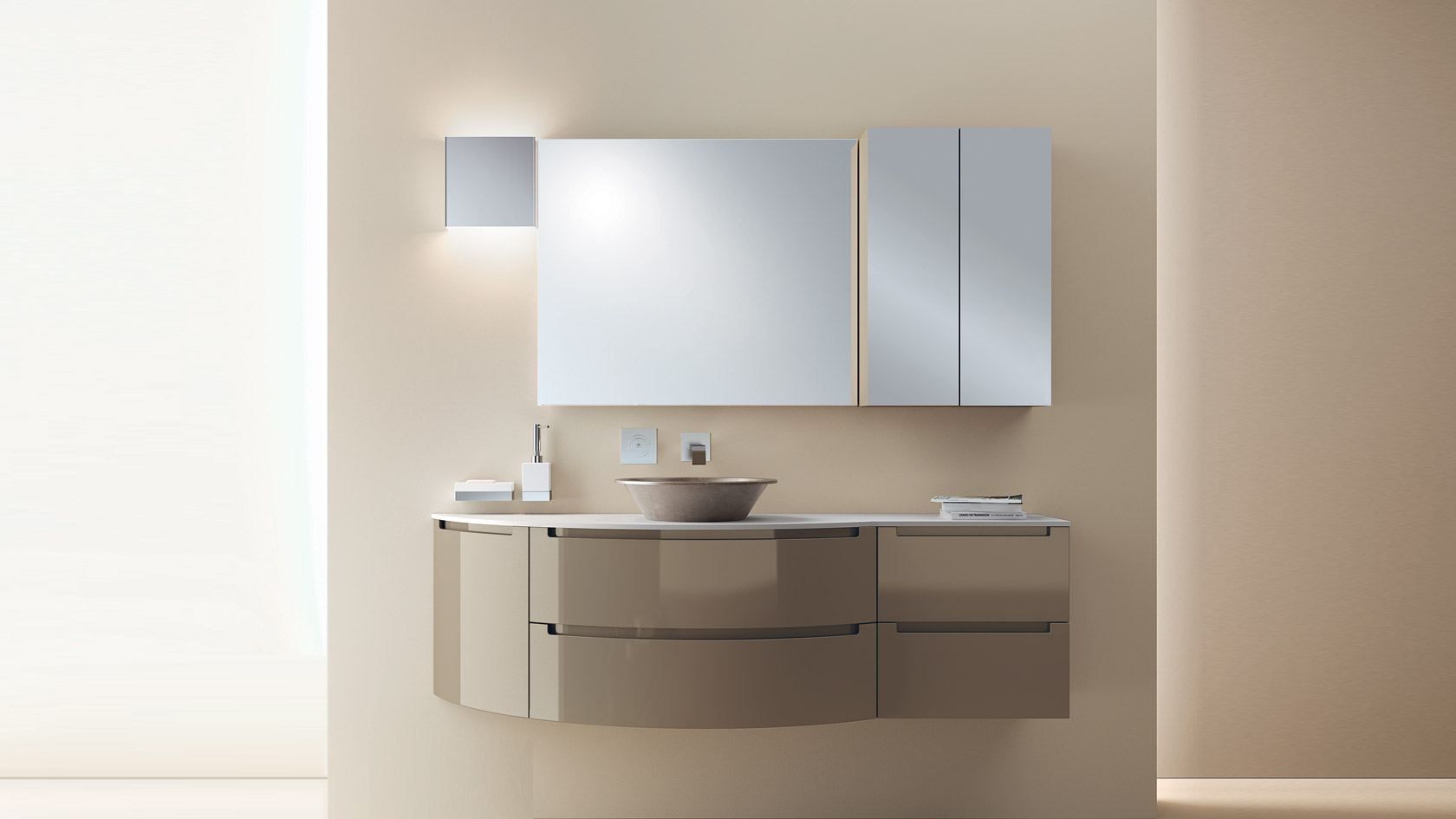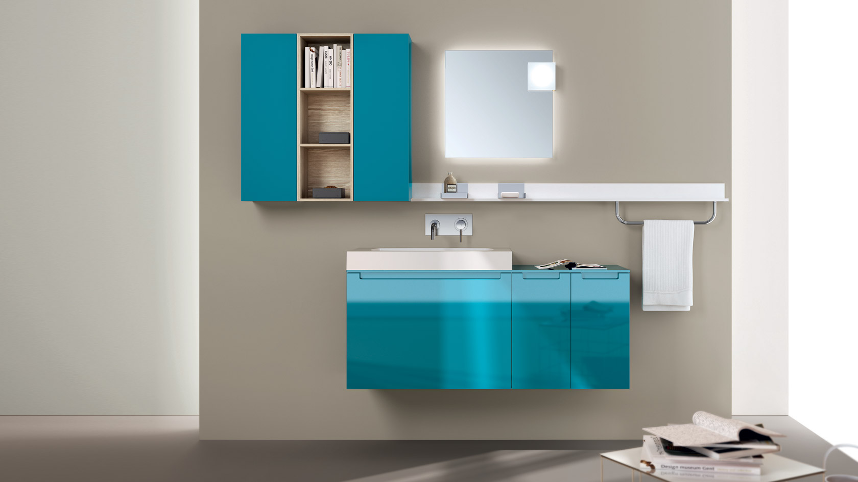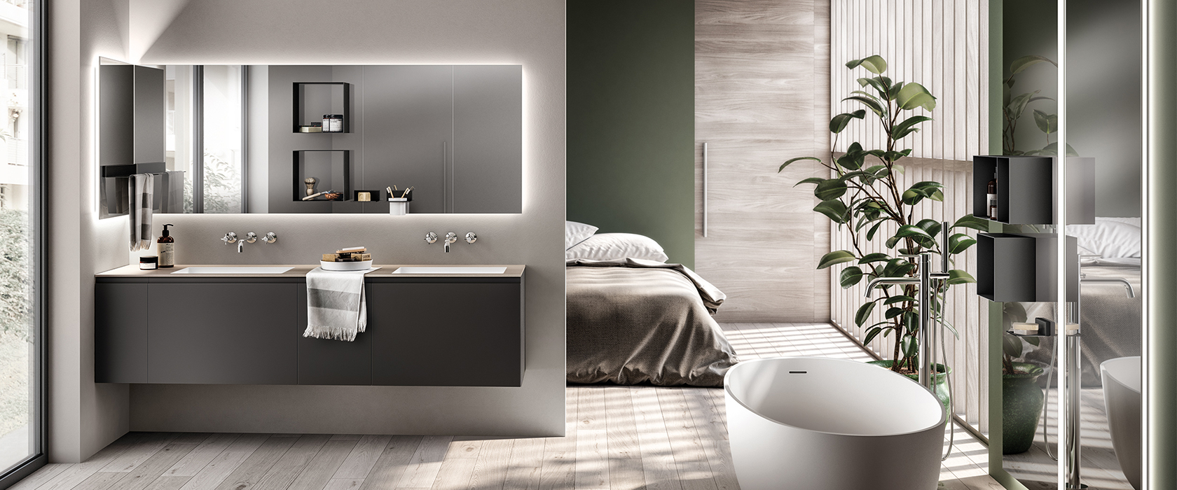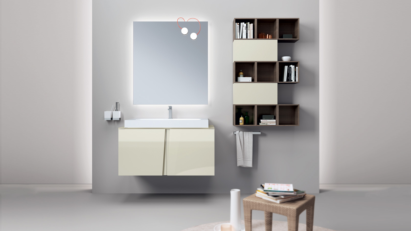 Raffinati protagonisti minimal del bagno Rivo sono i moduli sospesi caratterizzati da gole inclinate a 45°, i vani a giorno e i pensili.