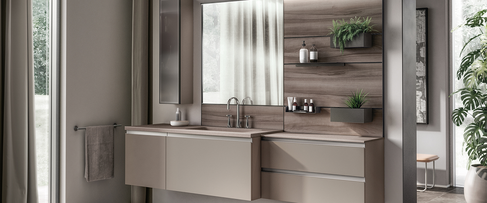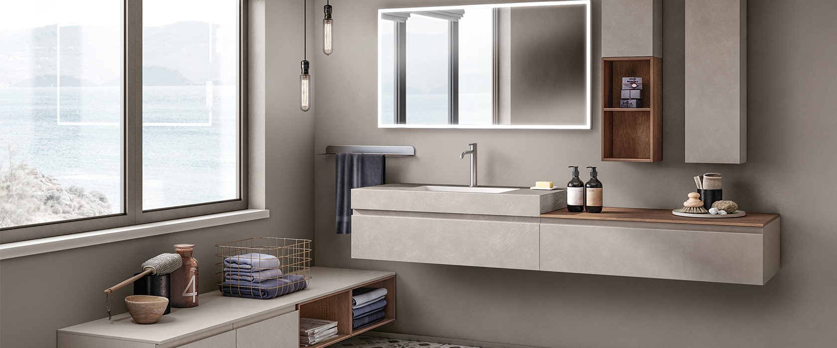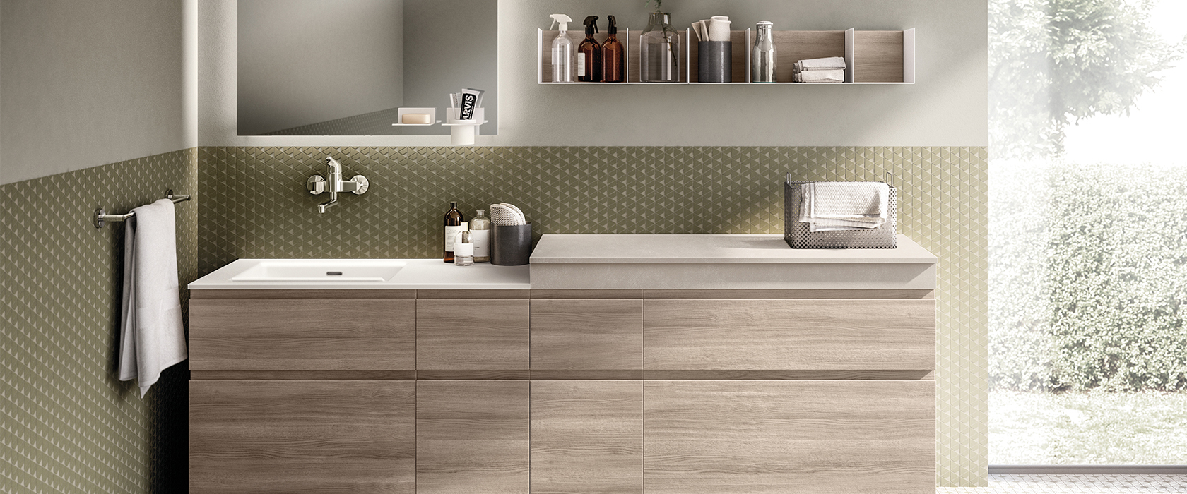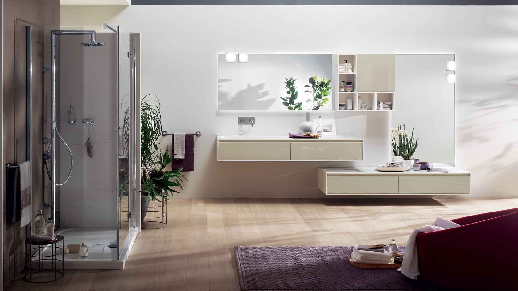 Raffinati protagonisti minimal del bagno Rivo sono i moduli sospesi caratterizzati da gole inclinate a 45°, i vani a giorno e i pensili.