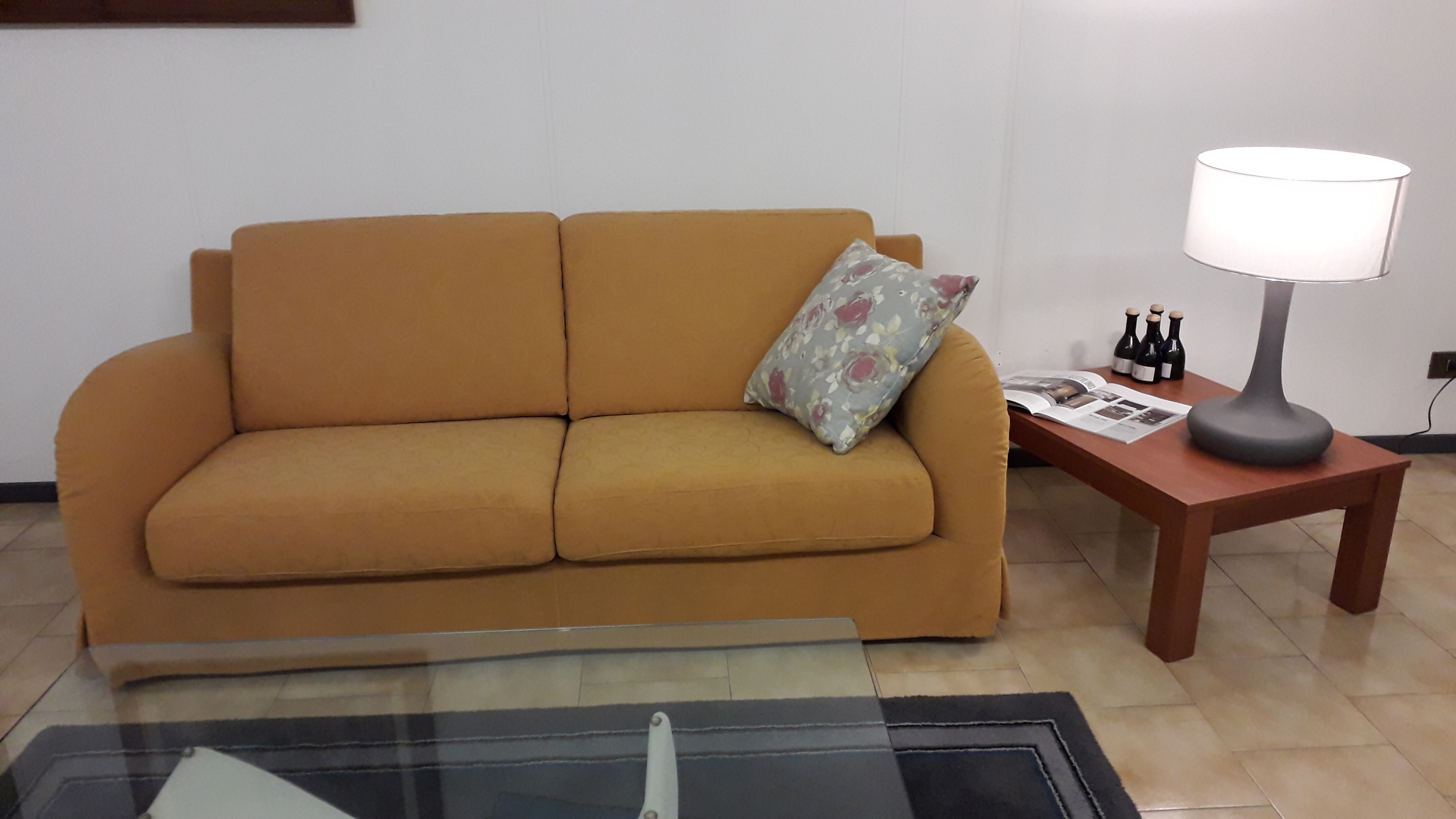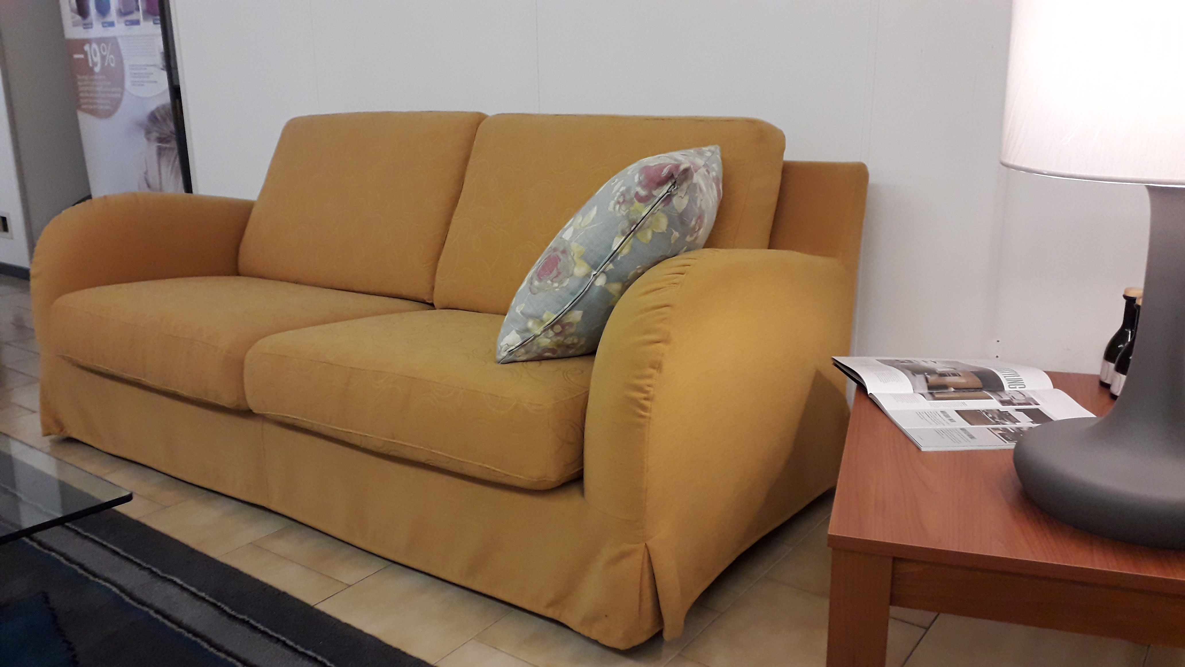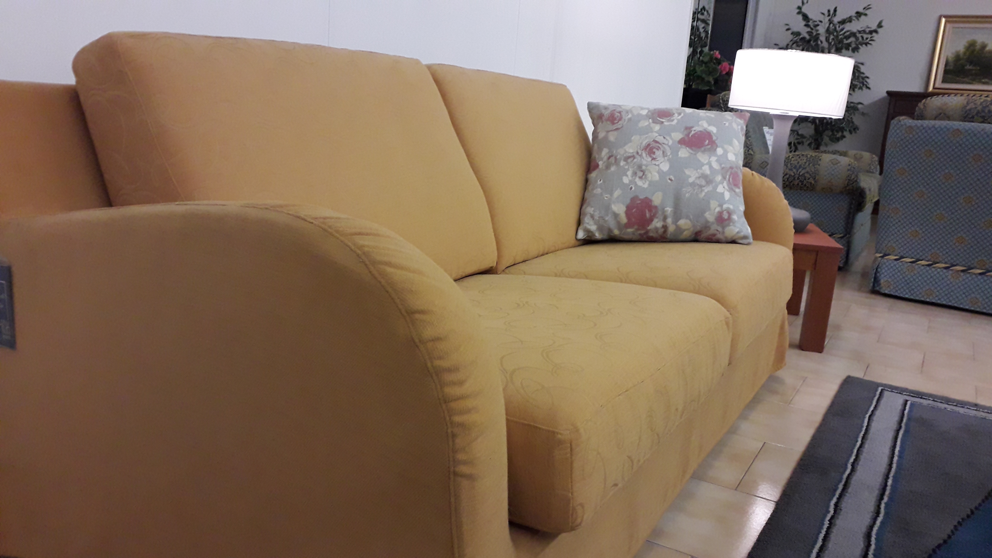 Divano a 3 posti in tessuto giallo con braccioli sagomati